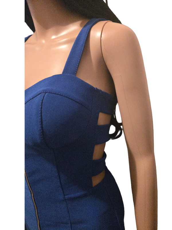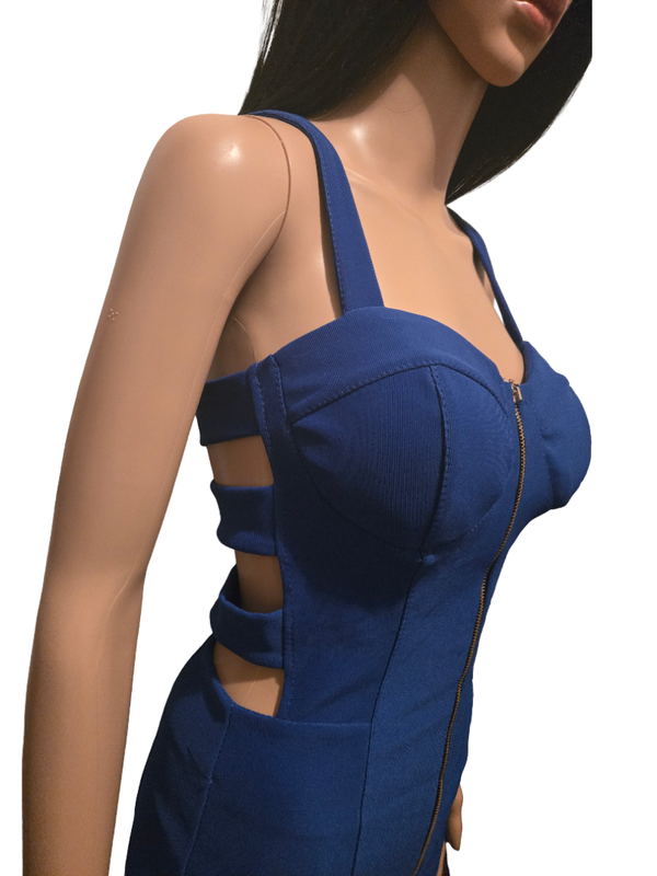 Robe bleu denim à la coupe féminine et moderne, avec fermeture zippée dorée sur le devant pour une touche chic et tendance.