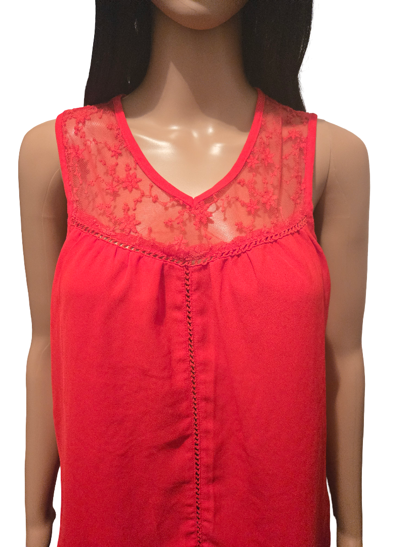 Top rouge fluide sans manches dentelle – col V élégant