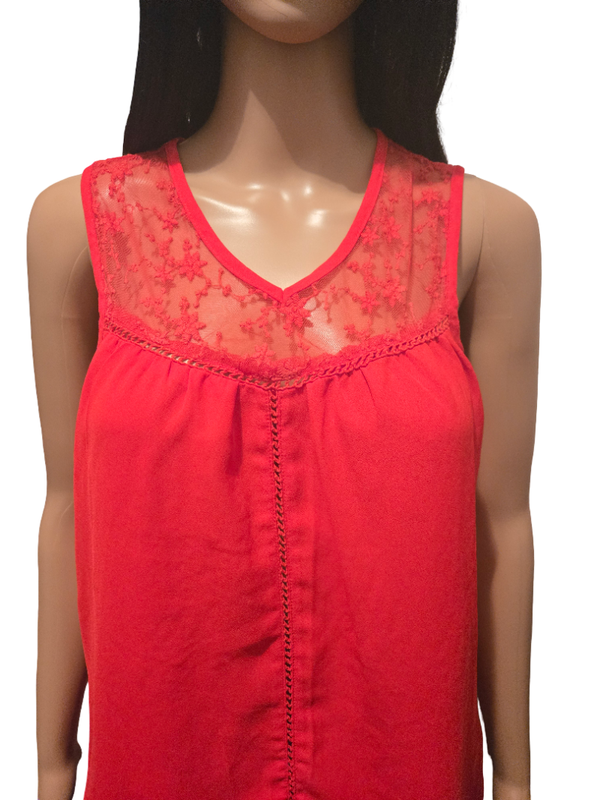 Top rouge vif sans manches avec empiècement en dentelle florale transparente au niveau du col et des épaules.