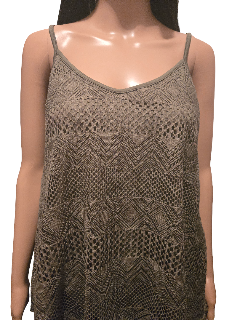 Débardeur kaki à fines bretelles en maille crochet ajourée.