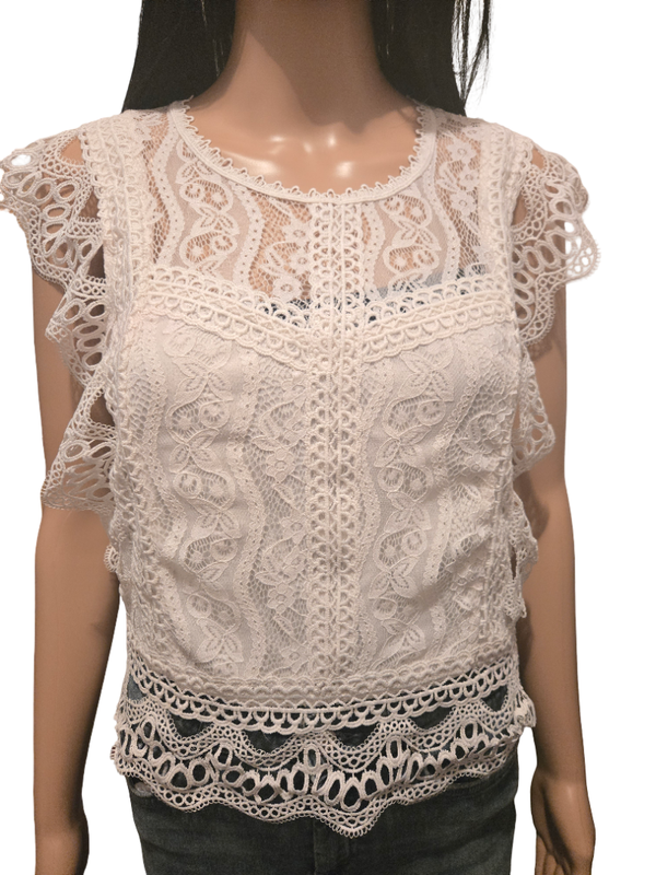 Magnifique top en dentelle blanche/écrue avec détails ajourés et finitions crochet.
