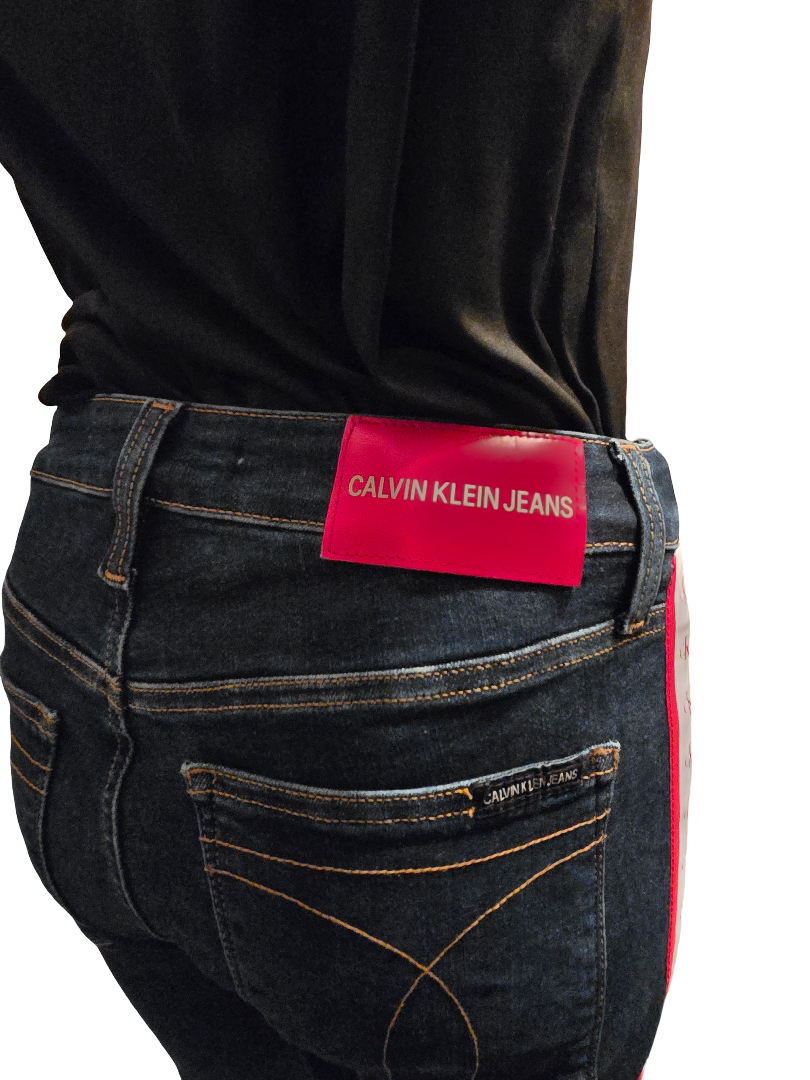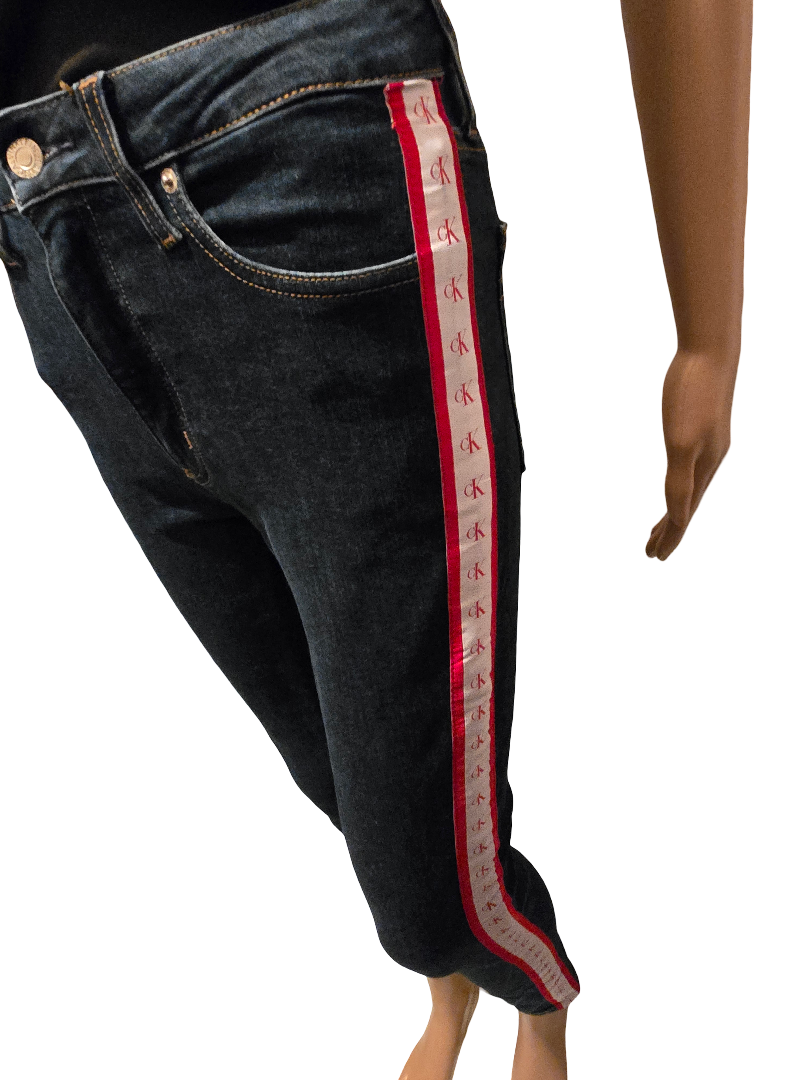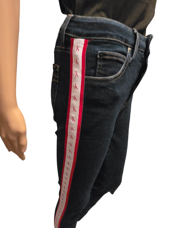 Jean skinny bleu foncée Calvin Klein – bande latérale rouge – taille haute – slim