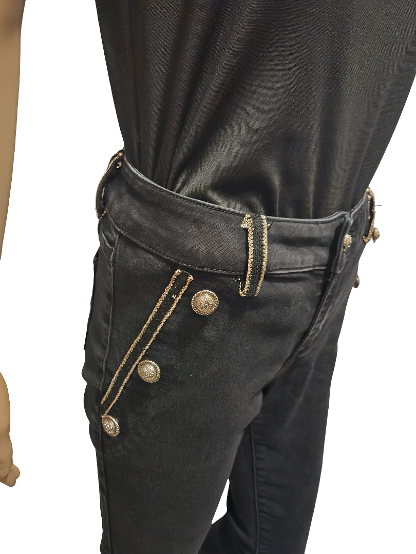 Pantalon noir coupe slim près du corps avec jolis boutons décoratifs dorés sur les côtés.