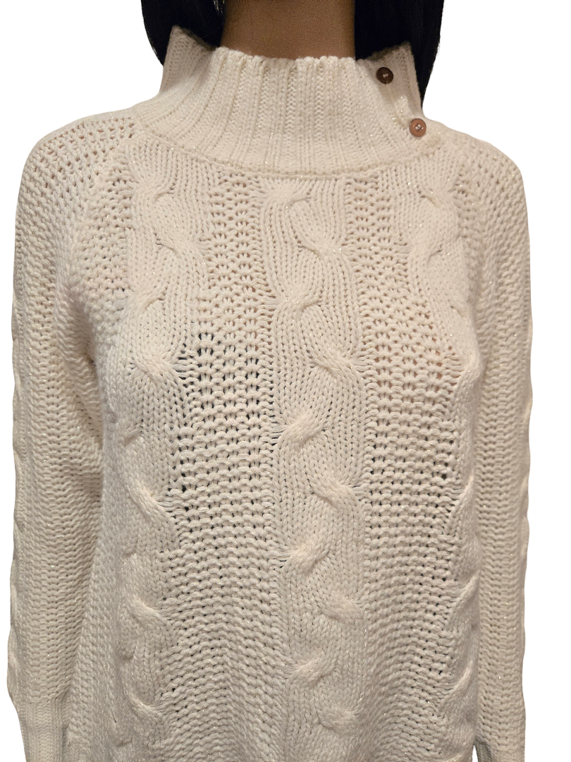 Pull en maille épaisse blanc uni avec jolis motifs torsadés et col montant boutonné sur le côté pour une touche élégante et originale.