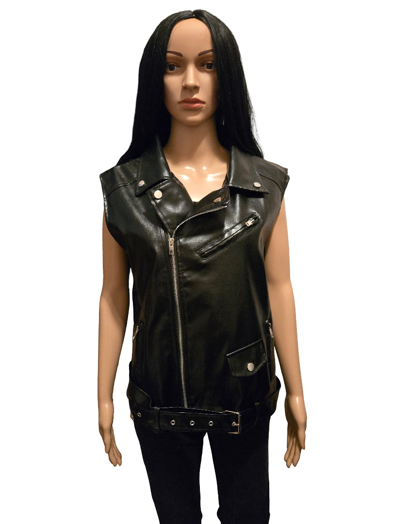 Cette veste sans manches effet cuir apporte une touche rock et moderne à votre tenue. Avec sa fermeture zippée, ses détails métalliques et sa coupe biker, elle est parfaite pour créer un look tendance et affirmé. Elle se porte facilement avec un jean, une robe ou une jupe pour un style chic et audacieux.
