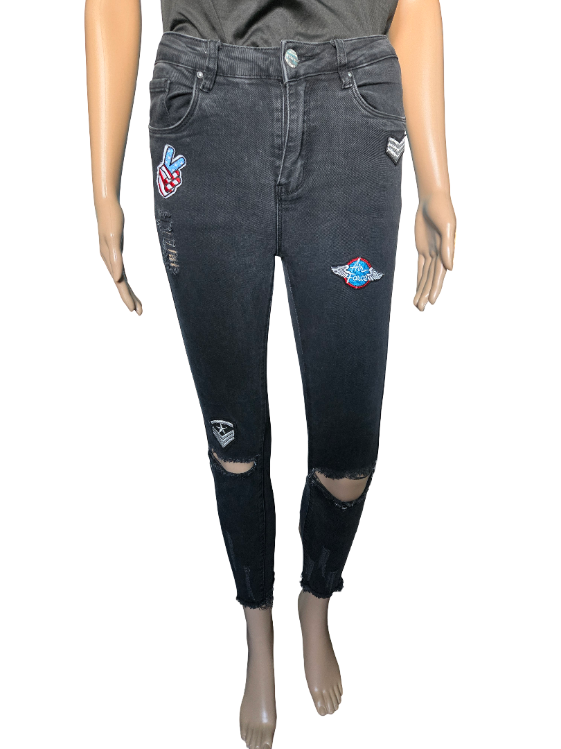 Jean noir coupe slim avec effet destroy et patchs brodés pour un look moderne et tendance 🔥